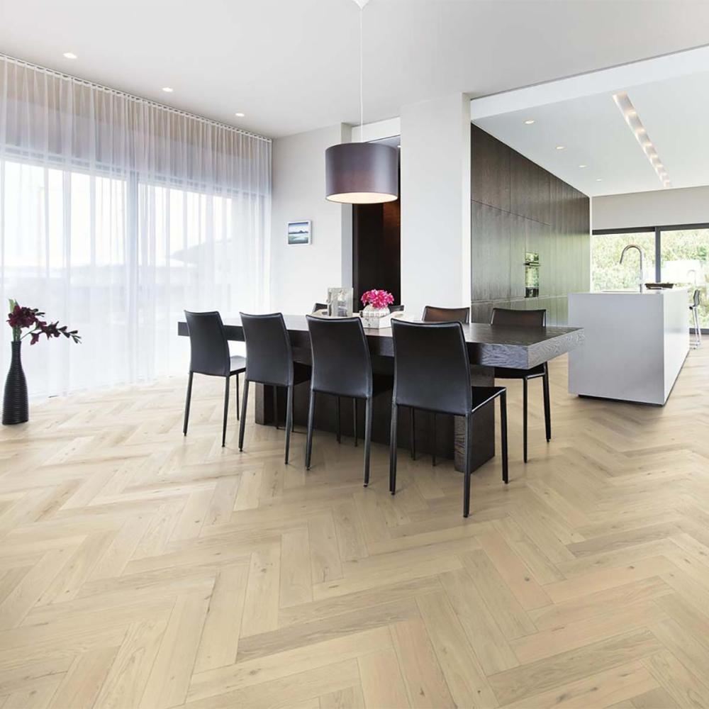 Kährs HERRINGBONE - pokládka do vzoru rybia kosť, 2-vrstvové parkety z prírodného dubu o hrúbke 11 mm.
