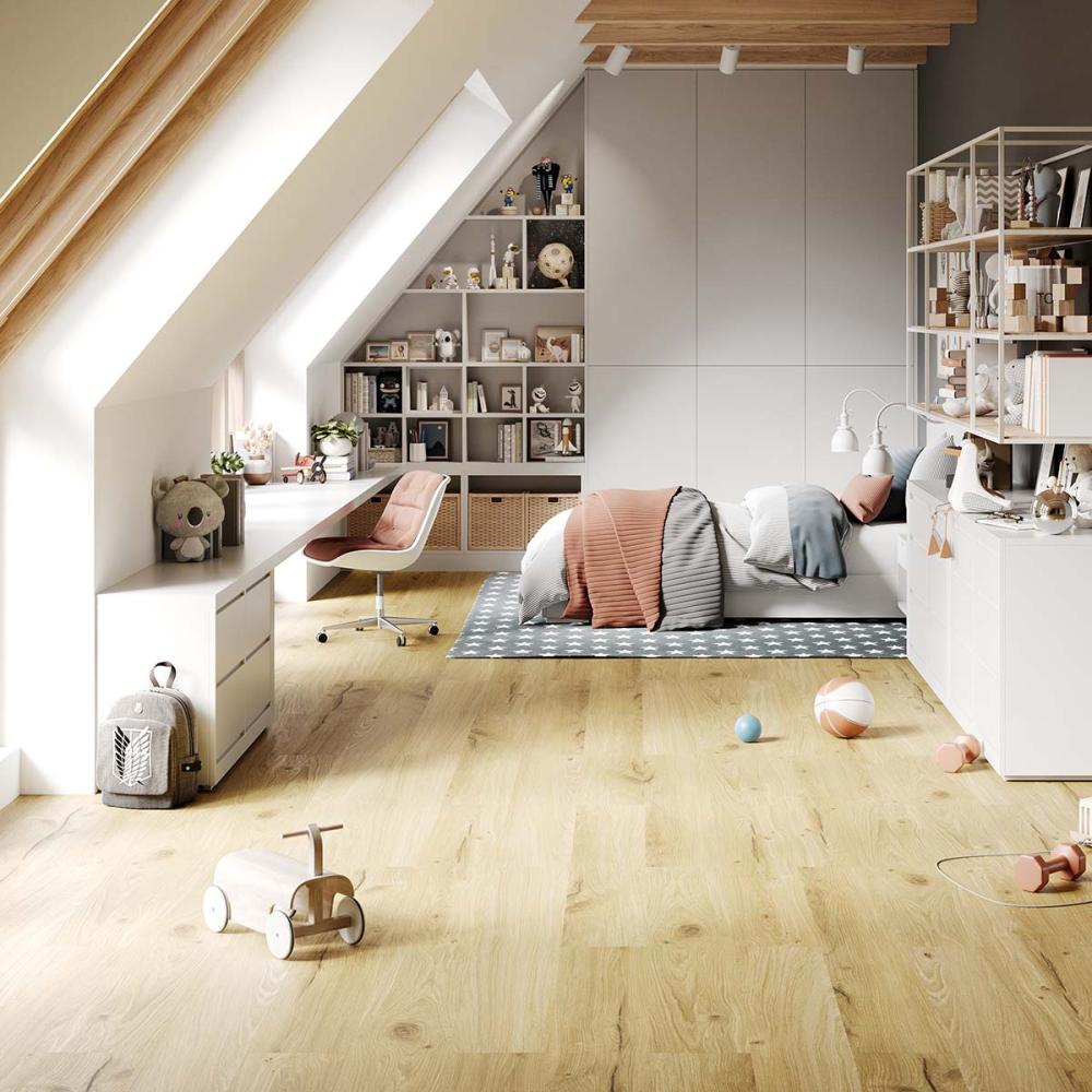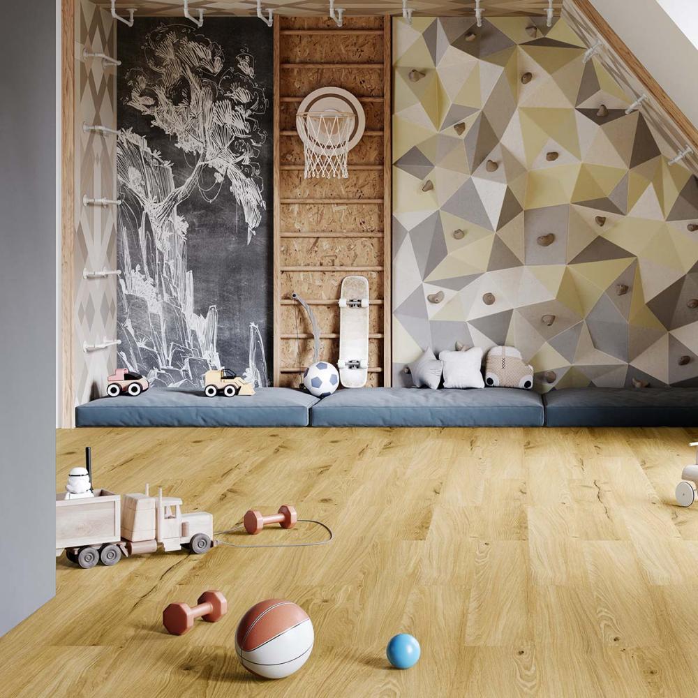 Kompozitná vodoodolná podlaha bez obsahu ftalátov a PVC s integrovanou podložkou.